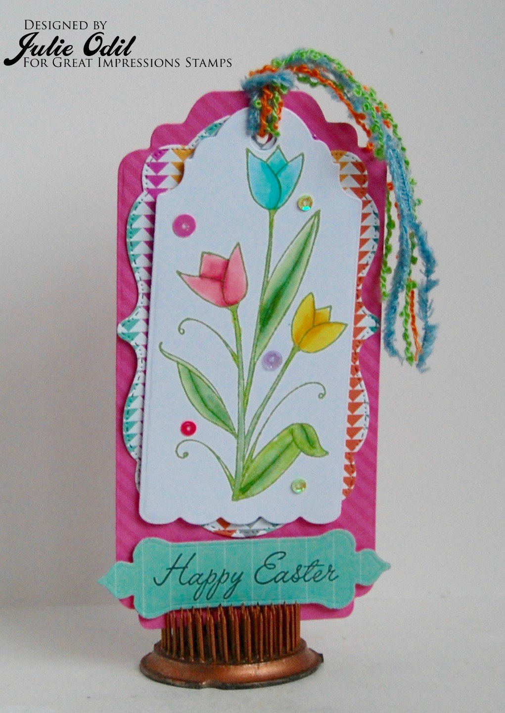 I added a bit of clear glitter pen to the butterflies and tulip to give a little sparkle and added a twine bow. Thanks for stopping by today! Come and join our monthly challenge! If you use a stamp from the Great Impressions online store, please link it up in our Customer Gallery, too!